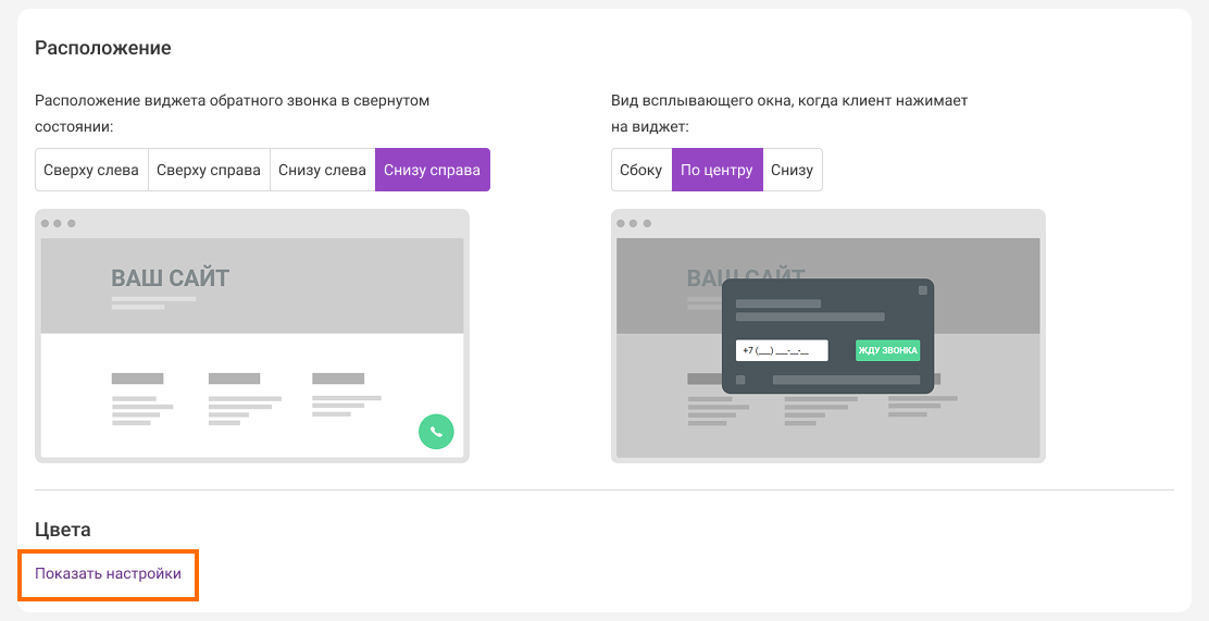 • Выберите, в каком углу сайта будет располагаться виджет обратного звонка в свернутом состоянии.