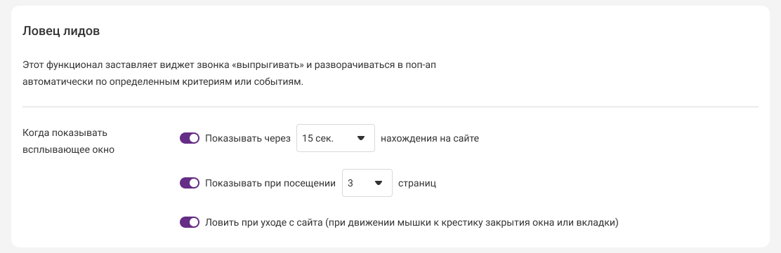 7. Настройте функцию «Ловец лидов», чтобы всплывающее окно с предложением заказать обратный звонок с сайта появлялось автоматически: когда посетитель находится на сайте дольше определённого времени, просмотрел уже несколько страниц или хочет уйти с сайта.