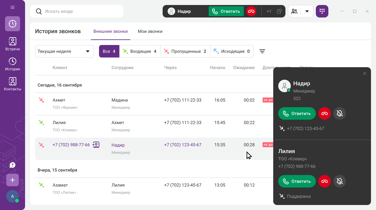 Чтобы не терять пропущенные, их число отображается в боковом меню и на вкладках в истории звонков. Здесь вы сможете узнать больше о контакте и быстро ему перезвонить. Гибкая система фильтров помогает найти любой звонок в архиве и при необходимости прослушать его запись.