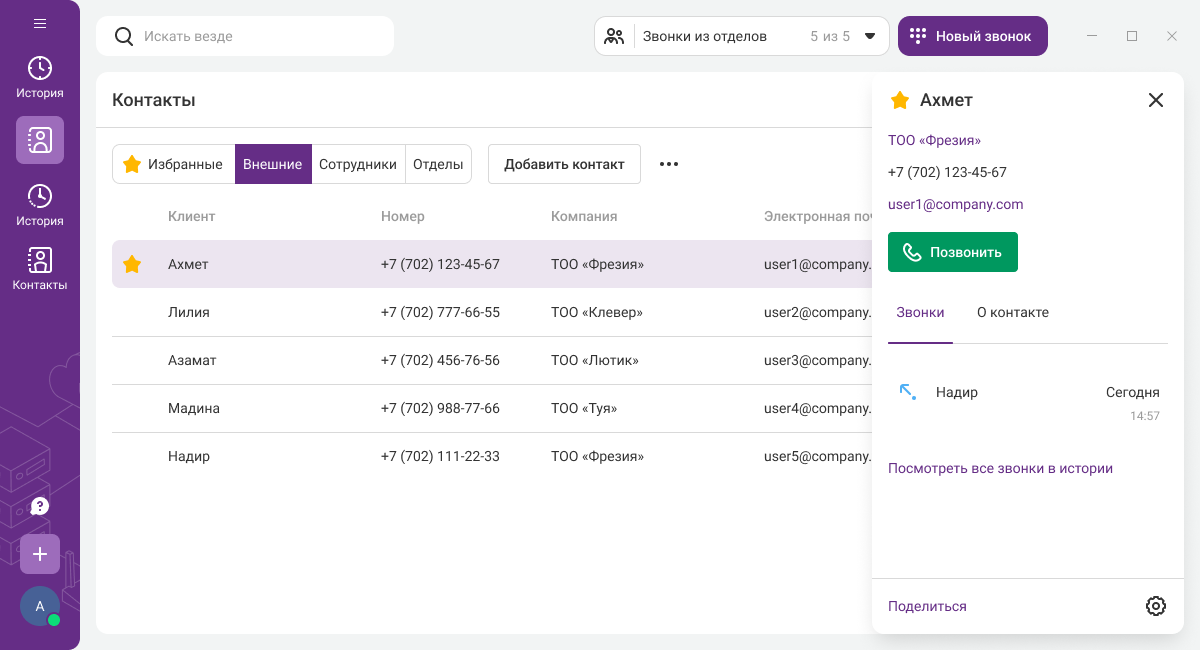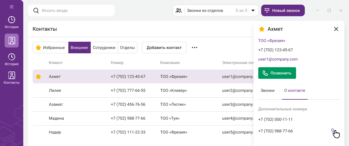 В Корпоративном мессенджере отображаются контакты клиентов и сотрудников. При регистрации сотрудника в АТС его контакт автоматически появляется у всех коллег. Контакты клиентов можно добавлять в мессенджер напрямую, они также доступны всем сотрудникам и синхронизируются с АТС.