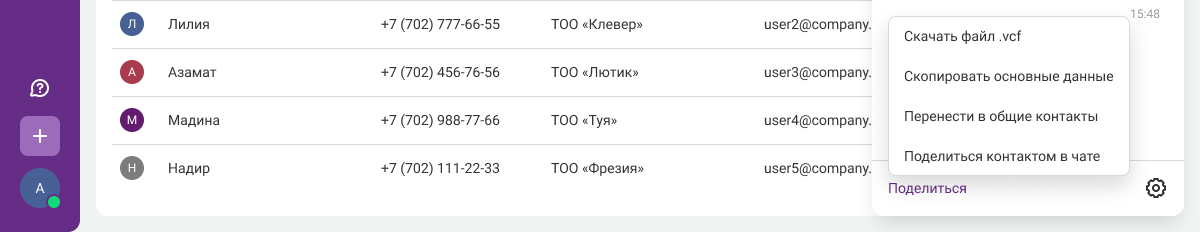 • Поделиться контактом в чате — в чате отобразится краткая карточка контакта с кнопками вызова и отправки сообщения (если это внутренний контакт).