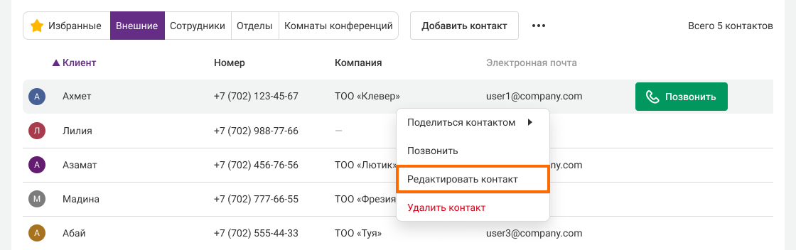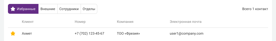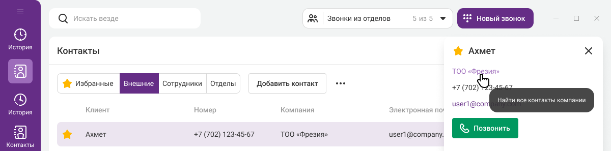 Чтобы найти нужный контакт, в поисковой строке начните писать значение одного из полей: имя, номер, e-mail контакта или название компании.