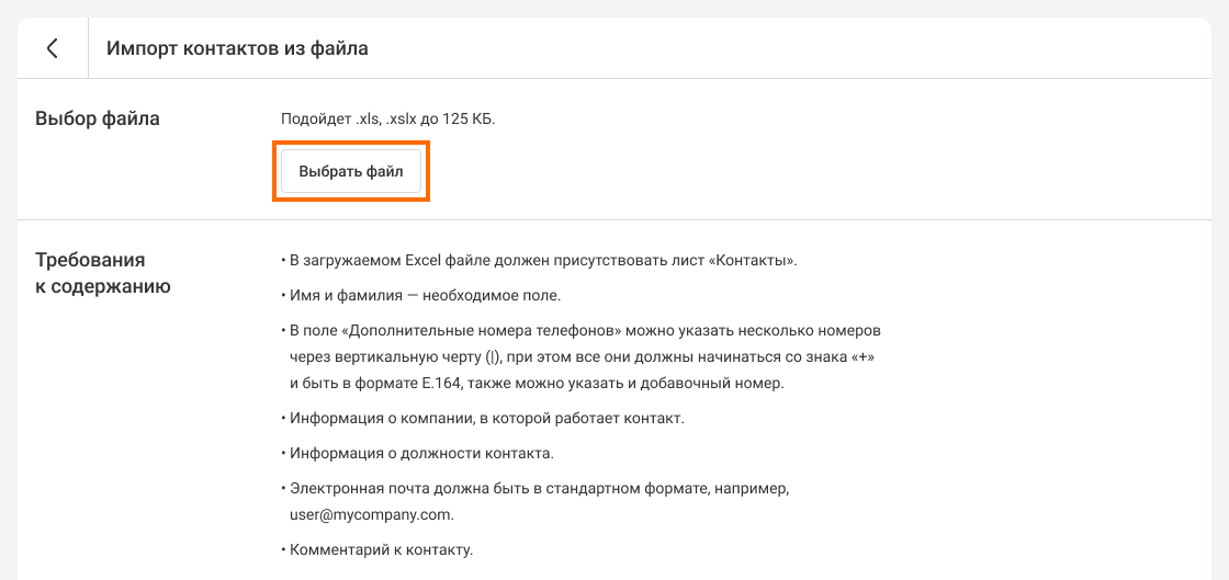 2. Скачайте шаблон файла Excel с примером заполнения списка контактов.