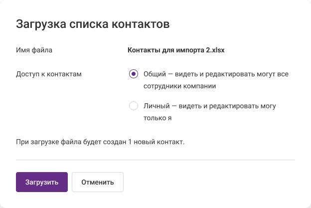 6. Подтвердите загрузку списка контактов, кликнув на кнопку «Загрузить».