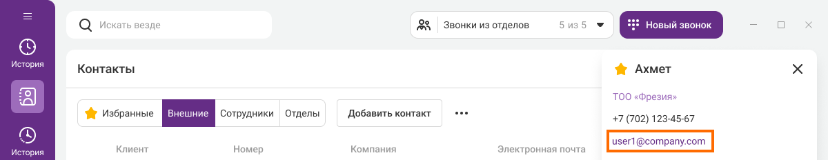 Чтобы ускорить процесс отправки e-mail контакту из АТС, нажмите на адрес электронной почты контакта в его карточке.