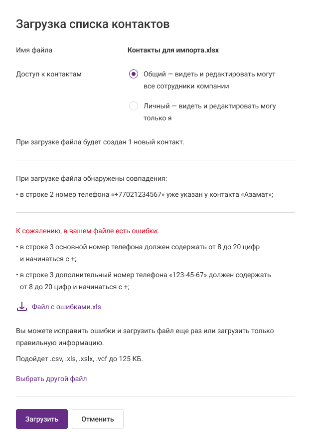 При загрузке xsl-файла с контактами может возникнуть два типа ошибок: