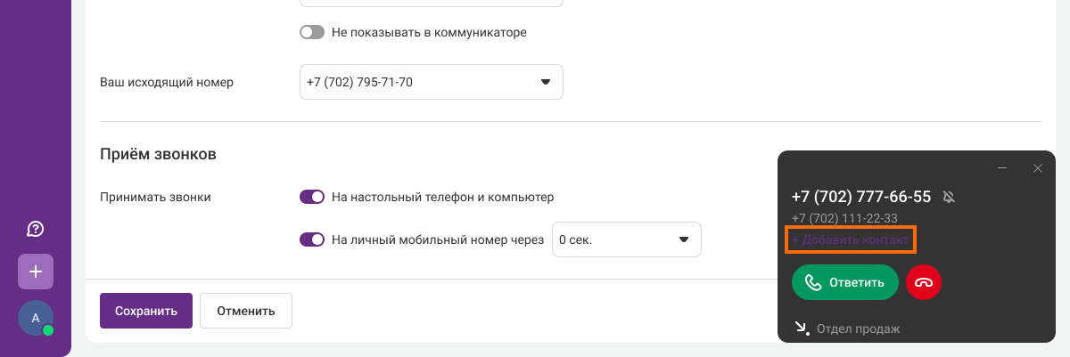После заполнения данных о клиенте нажмите «Сохранить». Все звонки сохраненного контакта будут автоматически проименованы — его имя будет отображаться в истории.