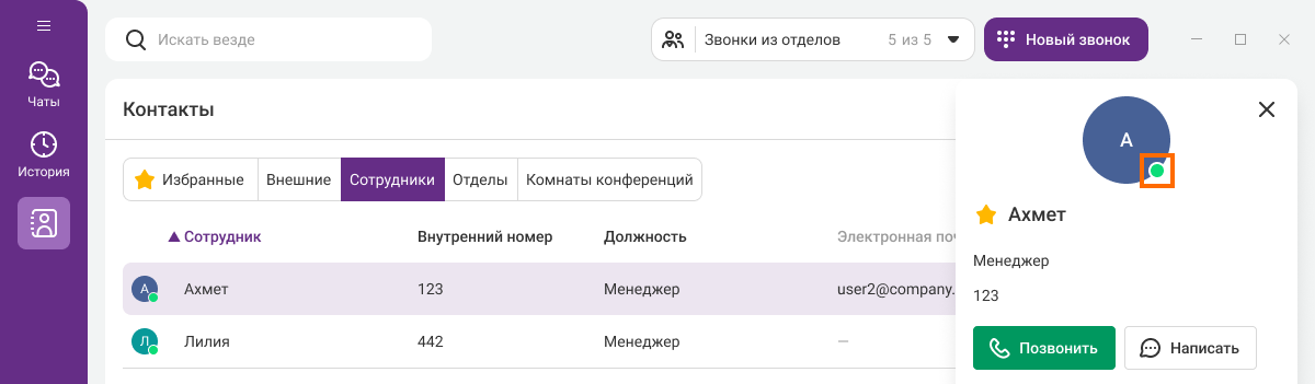 Чтобы узнать, доступен ли коллега для оперативной связи, обратите внимание на статус его присутствия в мессенджере. Этот статус отображается в карточке сотрудника, также его можно посмотреть в списке чатов.