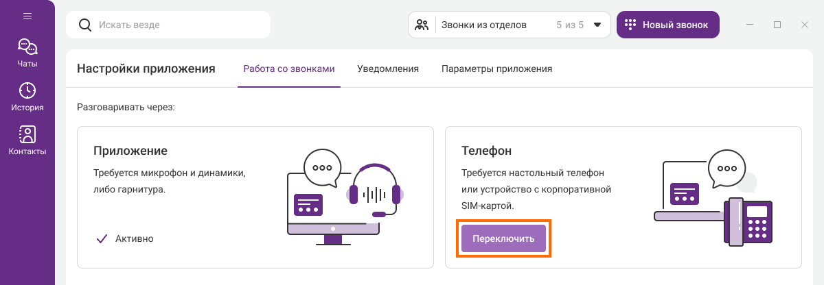По умолчанию настроен прием и совершение звонков с компьютера. Чтобы принимать входящие звонки в приложении через IP-телефон, можно включить интеграцию через CTI. Для этого нажмите на кнопку «Переключить».