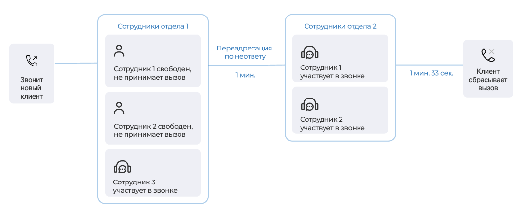 • Пропущенный звонок отделом — входящий на отдел, в рамках которого не состоялся разговор. Если звонок переадресован по неответу в другой отдел, но по нему не состоялся разговор, он считается пропущенным отделом, в который изначально поступил. Если разговор с клиентом начался в другом отделе, но при переводе звонка в вашем отделе трубку не взяли, звонок не засчитывается как пропущенный вашим отделом, ведь он остается успешным с точки зрения компании.