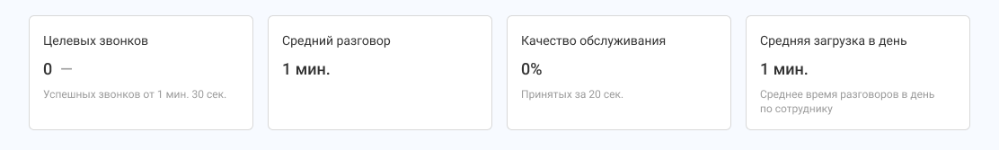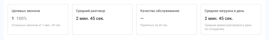 • Средняя загрузка за день: 2 мин. 45 сек. Считается по всем сотрудникам, которые участвовали в успешных звонках отдела. В нашем случае это оба сотрудника.