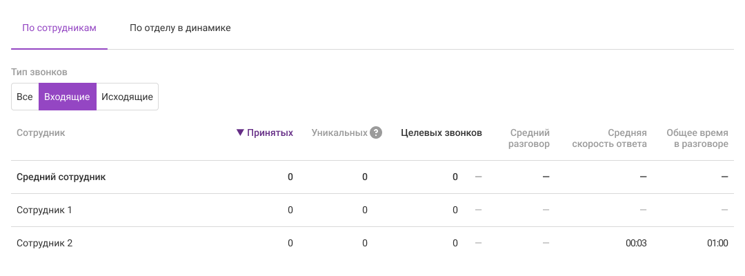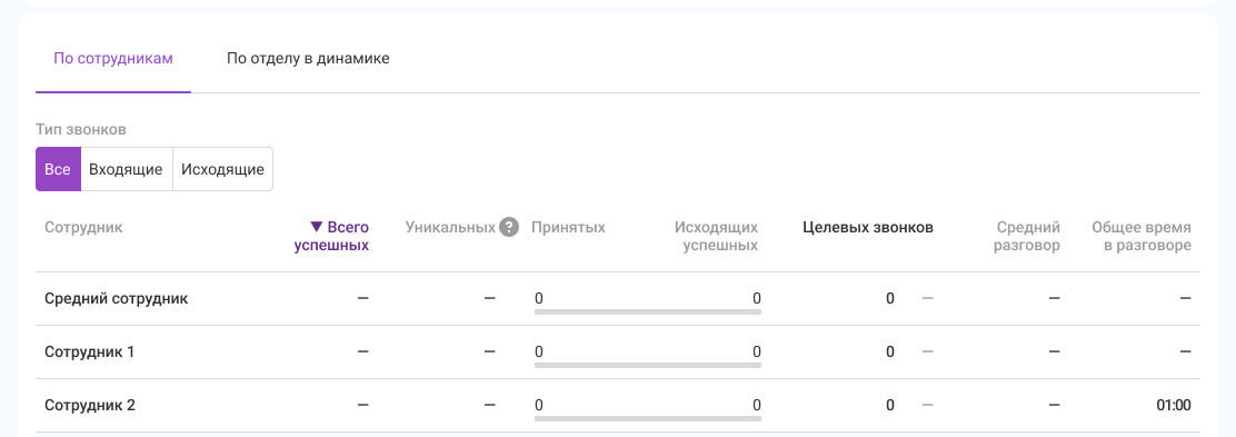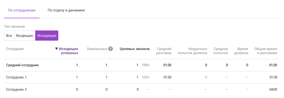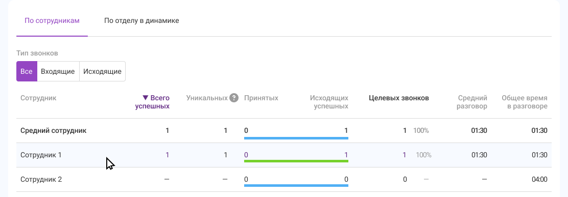 Средний сотрудник. Показатели в этой строке считаются как среднее арифметическое по сотрудникам, у которых есть хотя бы один успешный звонок за выбранный период.