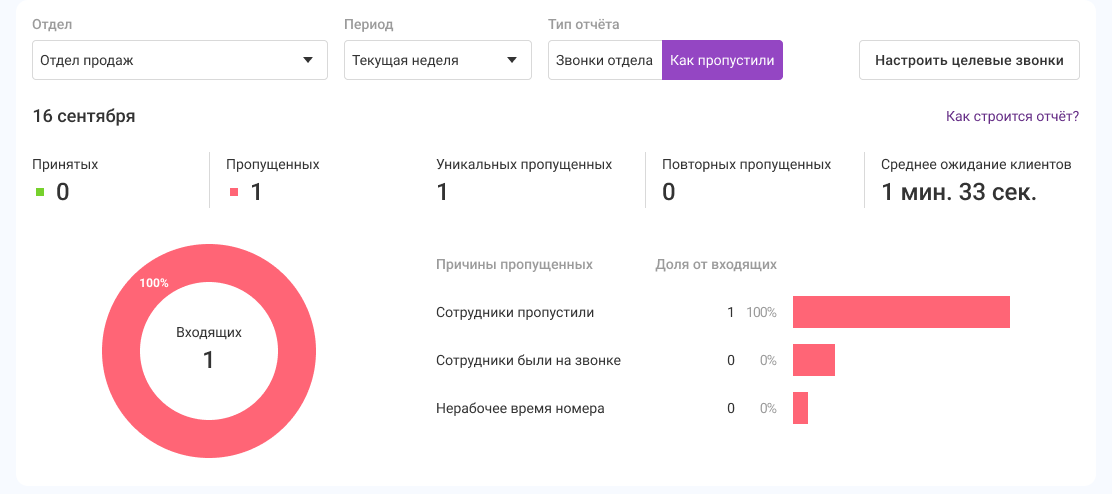 В успешных звонках сотрудников изменений не будет, поэтому все изменения — в отчете «Как пропустили» по отделу 1 за сегодня.