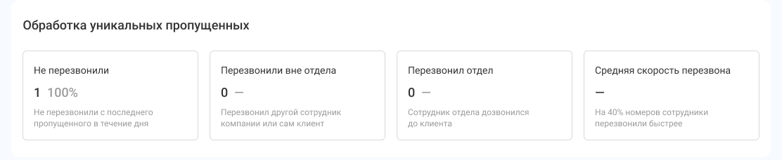 • Перезвонил отдел — количество и доля уникальных номеров среди пропущенных отделом, по которым состоялся успешный перезвон сотрудниками отдела.