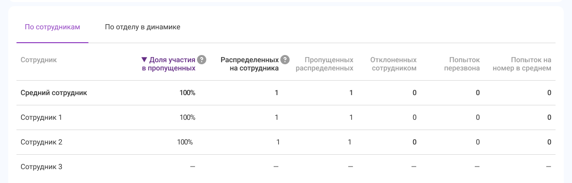 • Доля участия в пропущенных: 100% у сотрудника 1 и сотрудника 2. Они оба могли ответить на вызов, пока сотрудник 3 был на звонках.
