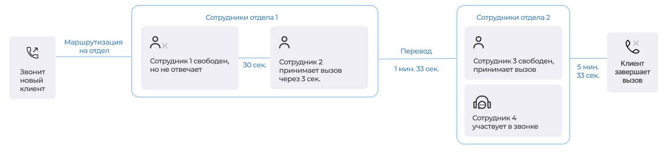 4. Сотрудник 2 ответил на звонок спустя 3 секунды и затем перевел его на другой отдел.