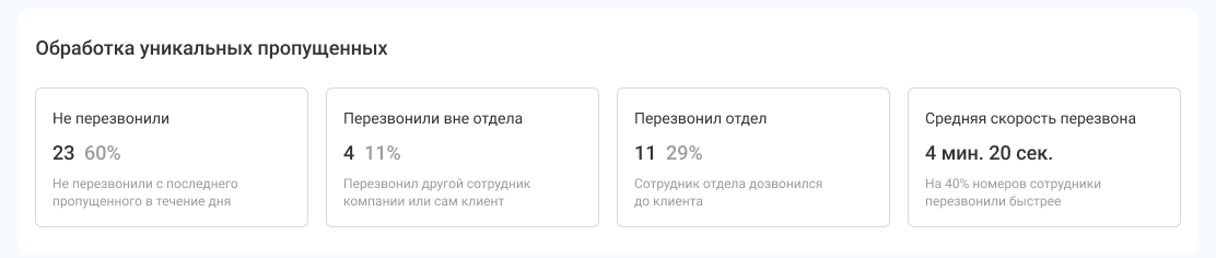 - Перезвонил отдел— какую долю клиентов с пропущенными звонками обработали сотрудники вашего отдела;