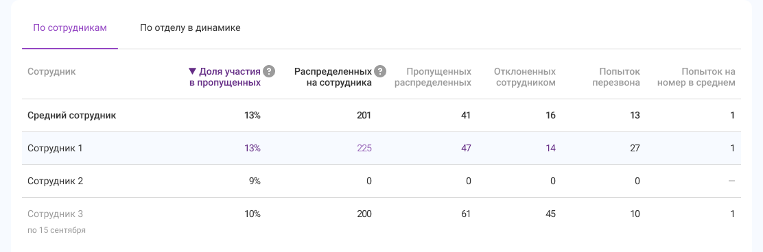- Пропущенных звонков, распределенных на сотрудника — как часто сотрудник пропускает распределенные на него звонки. Возможно, доля участия в пропущенных отделом высокая, потому что таких звонков в целом немного, но при этом сотрудник редко пропускает звонки;