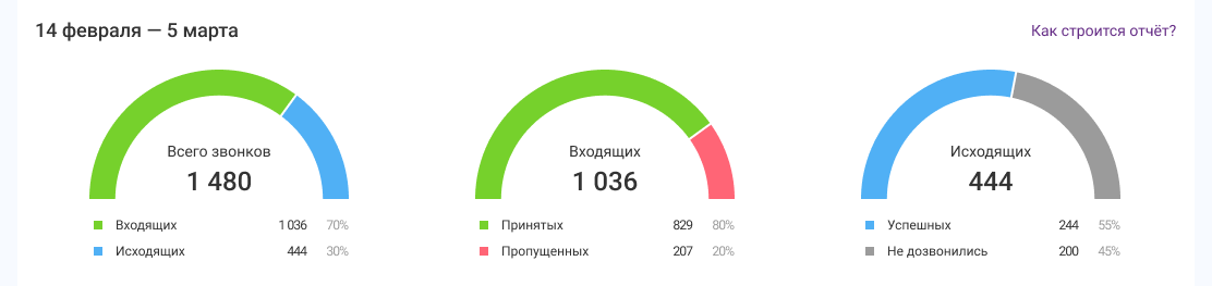 В отчете отображаются сводные данные обо всех звонках за выбранный период (день, неделя, месяц и т.д.). Каждый из счетчиков отвечает на ключевые вопросы руководителя: