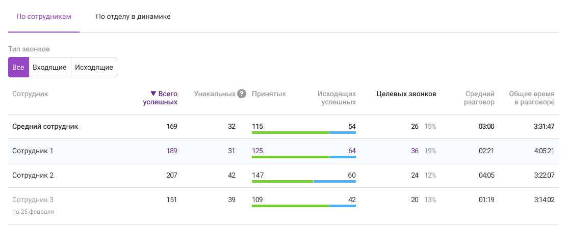 Для оценки вклада каждого сотрудника в результаты отдела используйте таблицу по звонкам сотрудников: по всем вызовам или отдельно по входящим и исходящим.