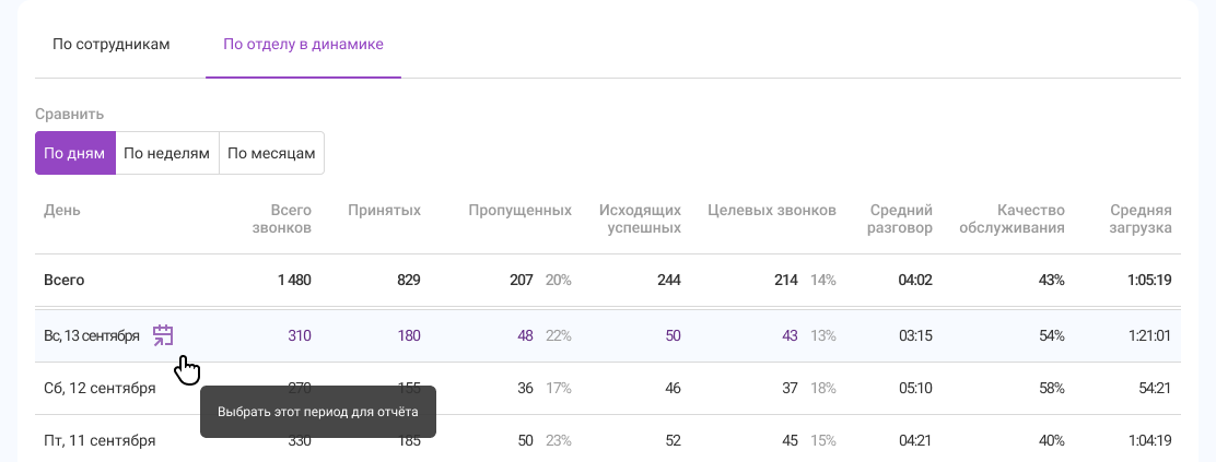 Сравнивая результаты по дням, обратите внимание, когда был пик по входящим и пропущенным — если средняя загрузка сотрудников в эти дни также высокая, а качество обслуживания ниже обычного, то, возможно, стоит увеличить количество сотрудников на линии.