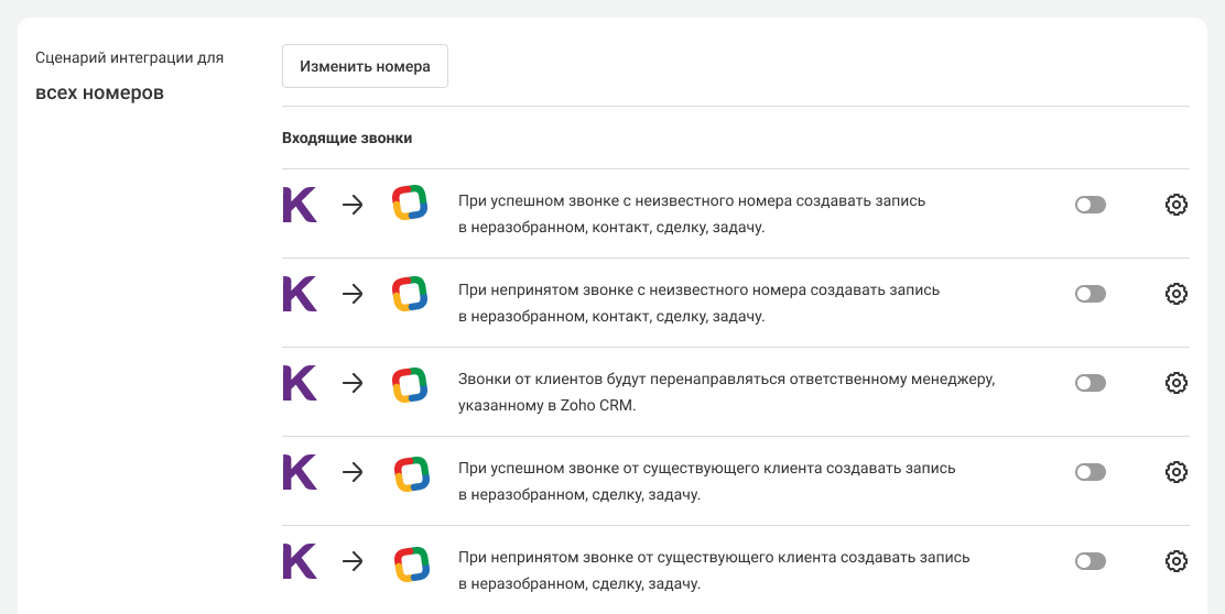 4. Вы можете настроить интеграцию для всех номеров сразу (этот вариант выбран по умолчанию) или для каждого в отдельности. Подробности — в статье «Настройка нескольких сценариев интеграции с CRM».