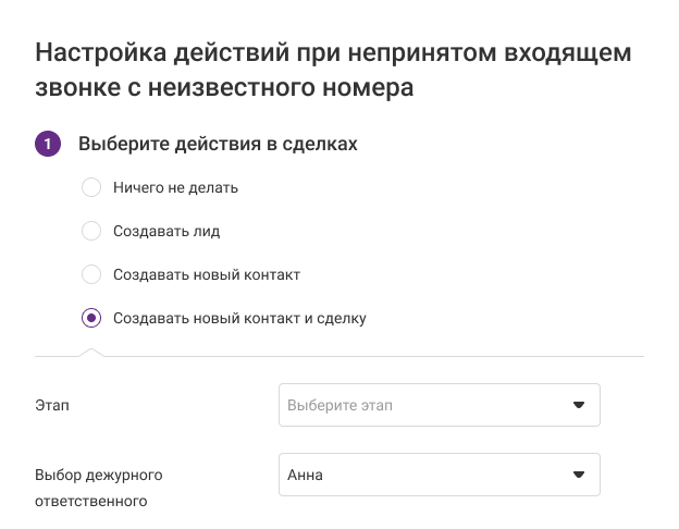 Например, если звонок поступил от существующего клиента, то ответственным за сделку и задачу может быть назначен сотрудник, принявший звонок, либо ответственный за контакт.